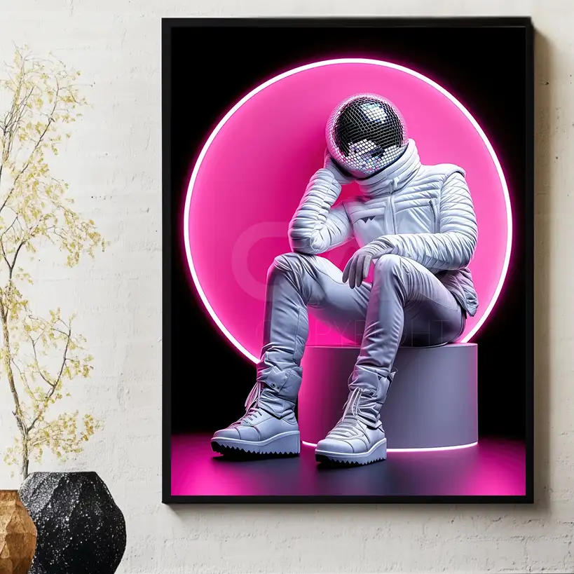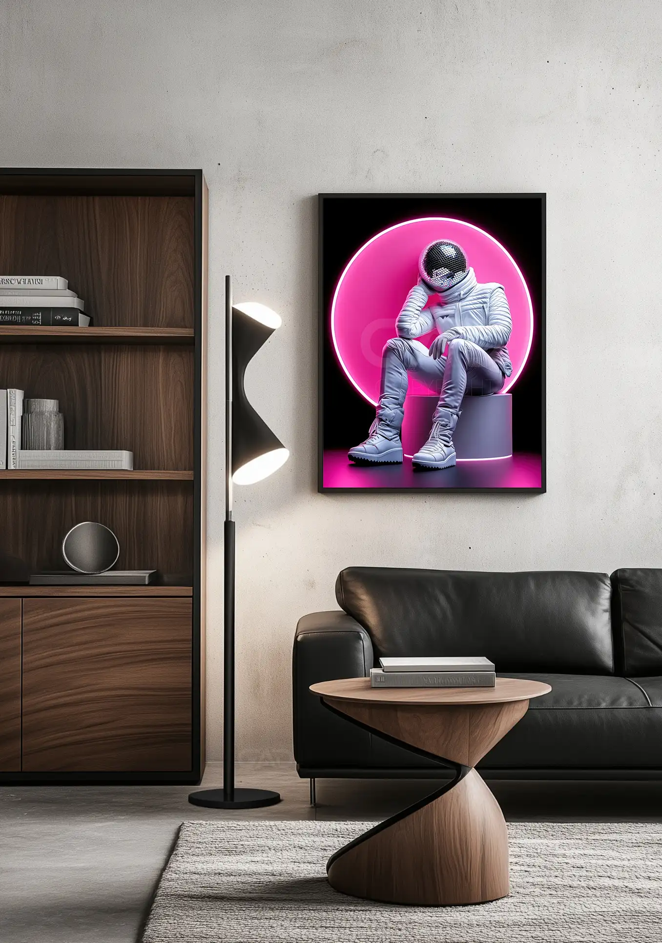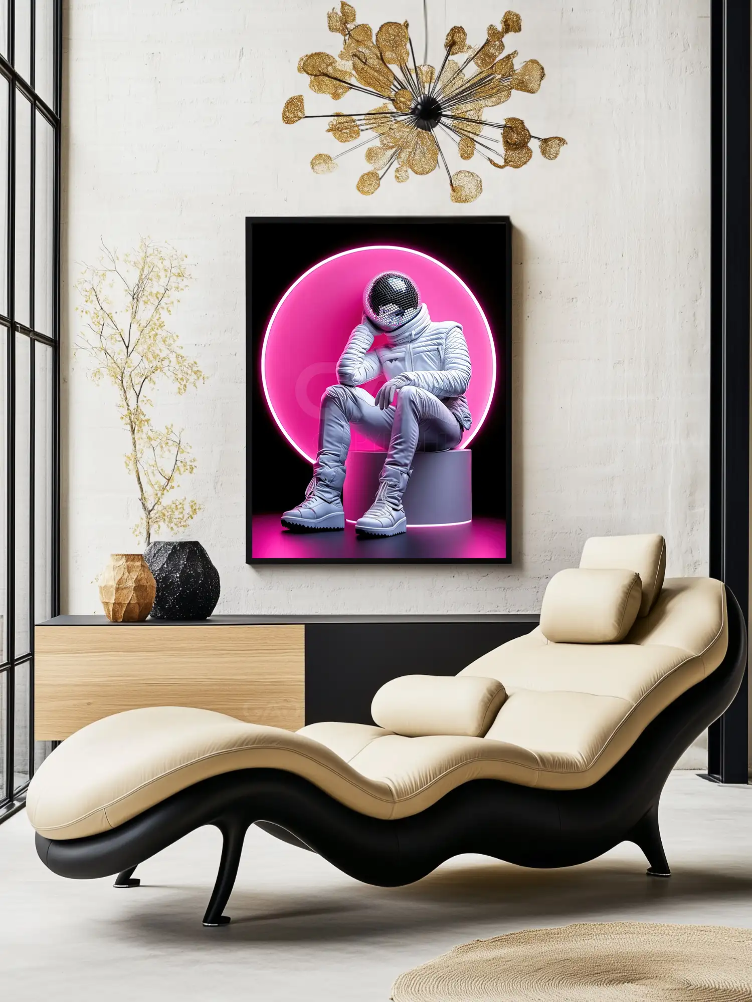 Ein fesselndes Plakat, das eine Figur mit einem Discokugelkopf zeigt, die eine einzigartige Verbindung zwischen menschlicher Form und festlicher Energie schafft. Die filigranen Details der Discokugel und die elegante Körperhaltung der Figur verleihen diesem Design einen Hauch von Originalität und Modernität und machen es zu einer eindrucksvollen Ergänzung für jeden Raum.