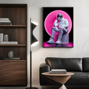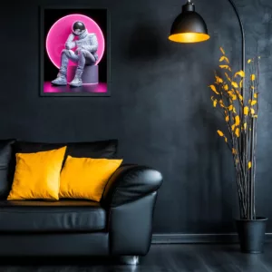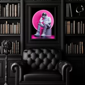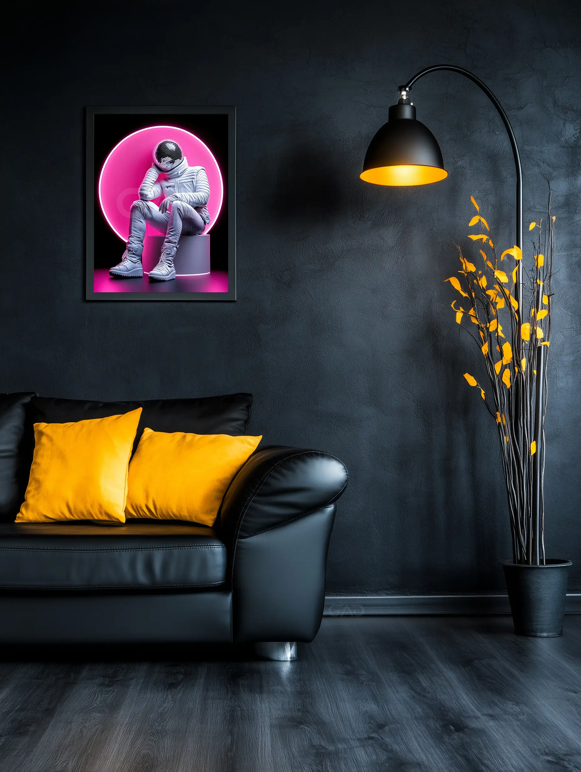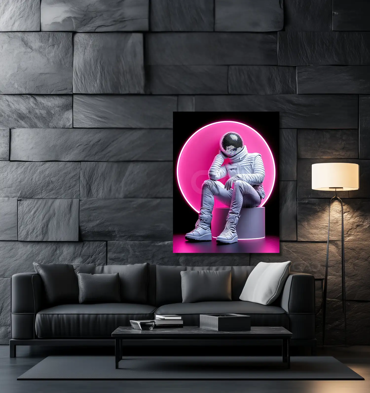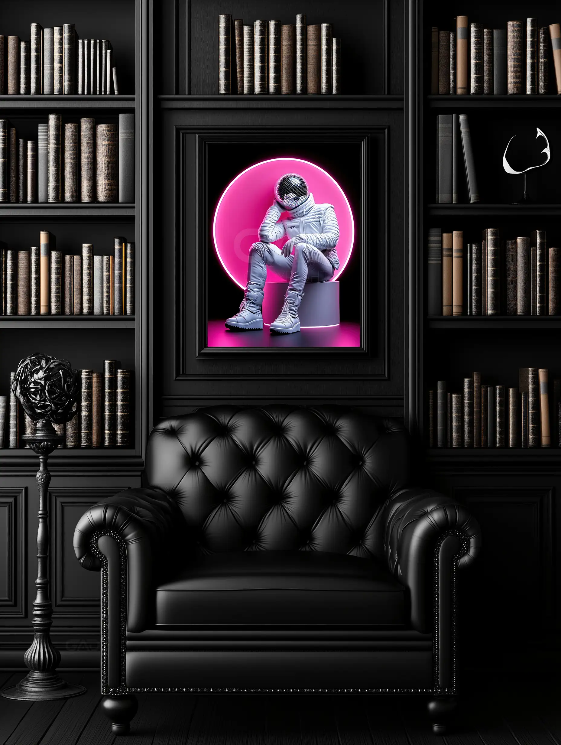 Ein fesselndes Plakat, das eine Figur mit einem Discokugelkopf zeigt, die eine einzigartige Verbindung zwischen menschlicher Form und festlicher Energie schafft. Die filigranen Details der Discokugel und die elegante Körperhaltung der Figur verleihen diesem Design einen Hauch von Originalität und Modernität und machen es zu einer eindrucksvollen Ergänzung für jeden Raum.