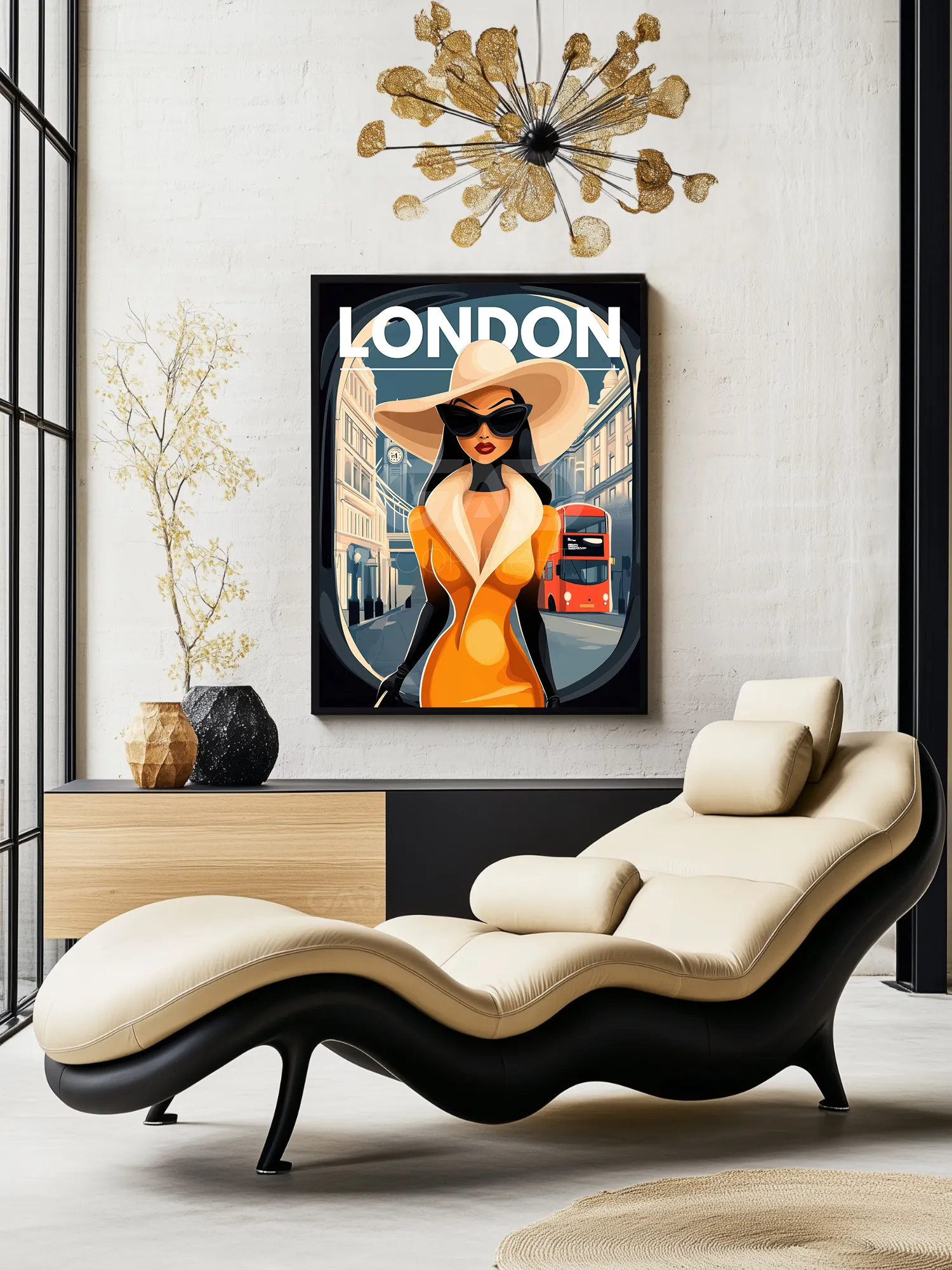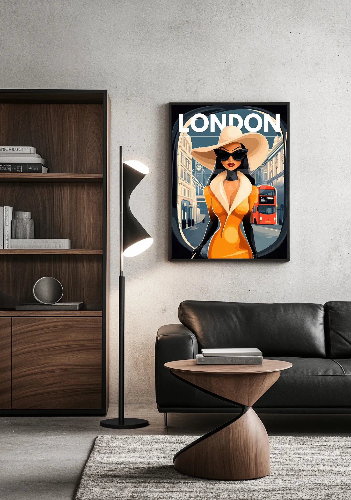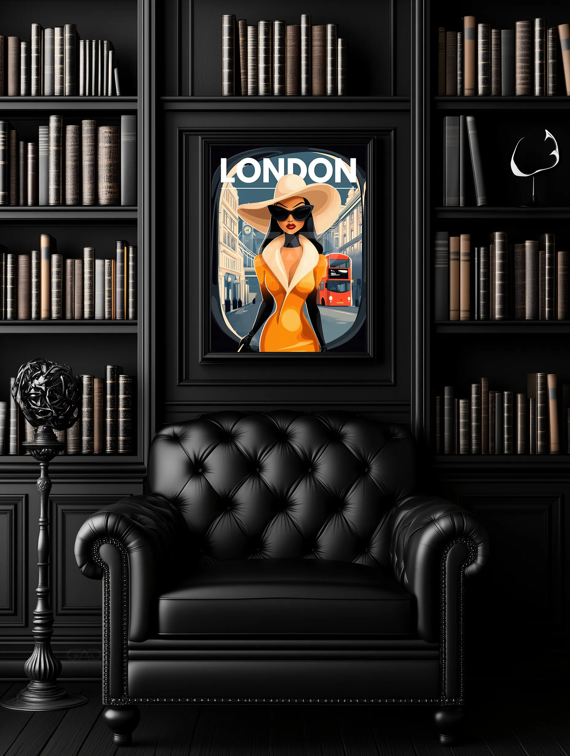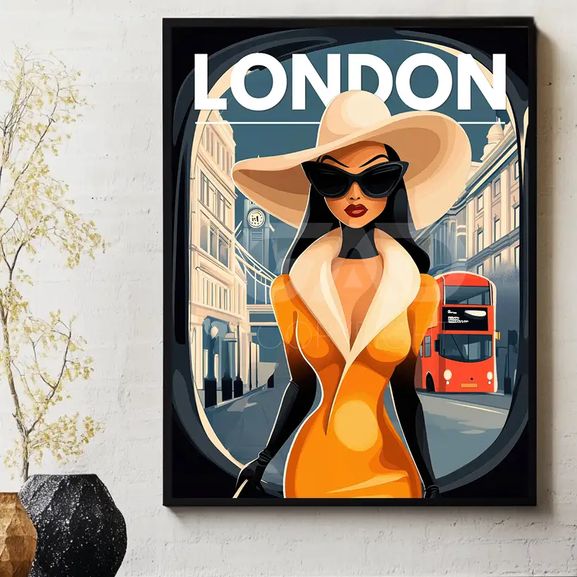 Capture the timeless elegance of London with this beautifully stylized poster. Featuring a sophisticated woman in a chic outfit strolling through the city, this artwork highlights the essence of London’s cosmopolitan charm. Iconic red double-decker buses and classic architecture set the perfect urban backdrop, blending fashion with the vibrant energy of the city.
