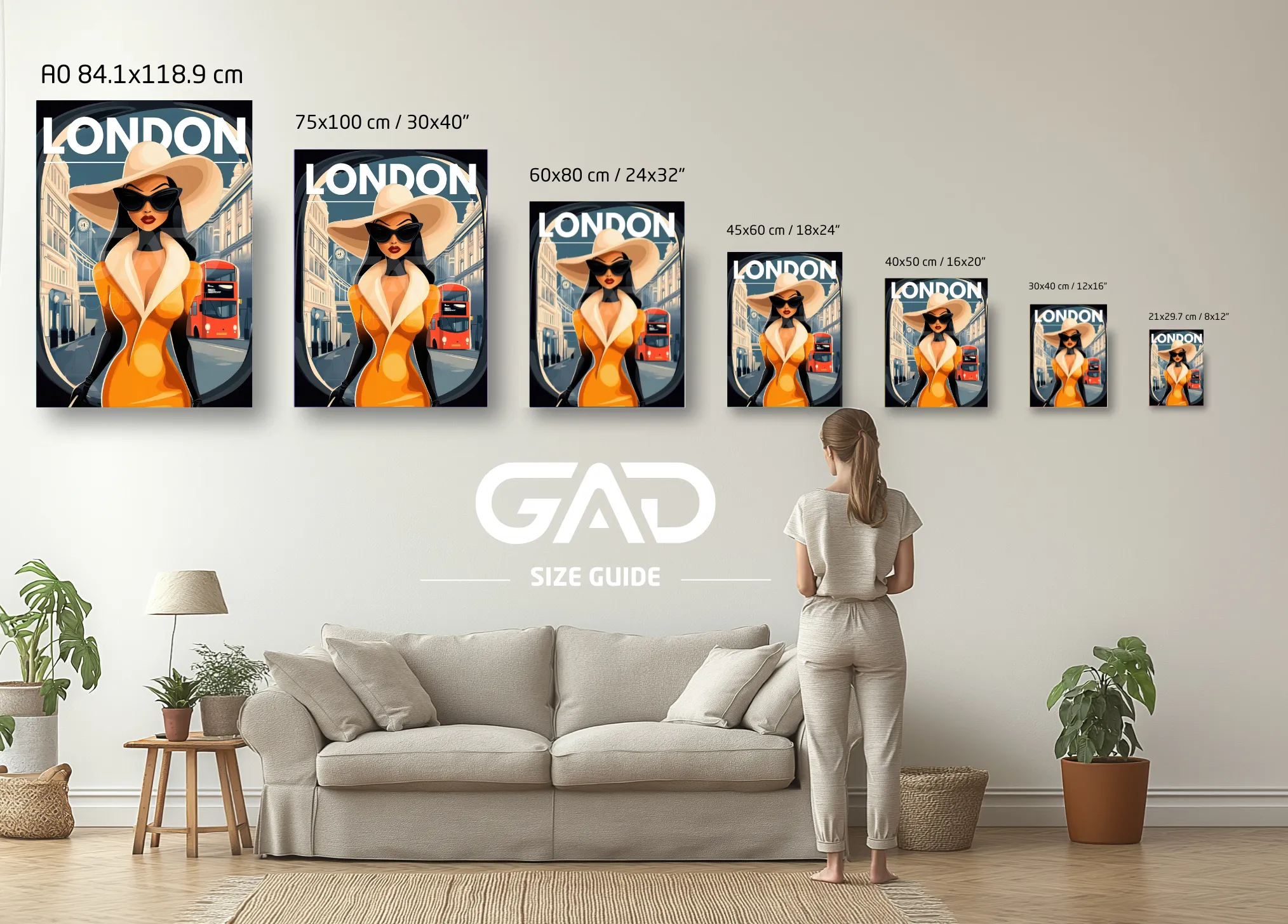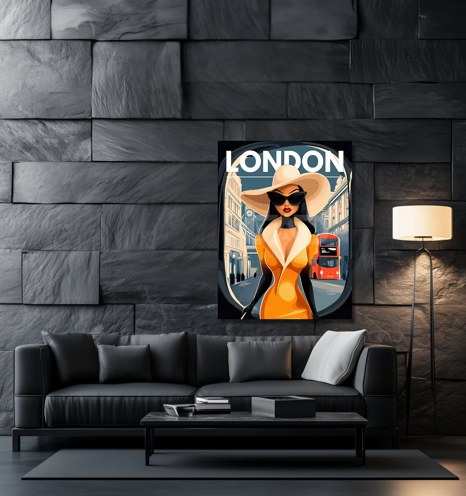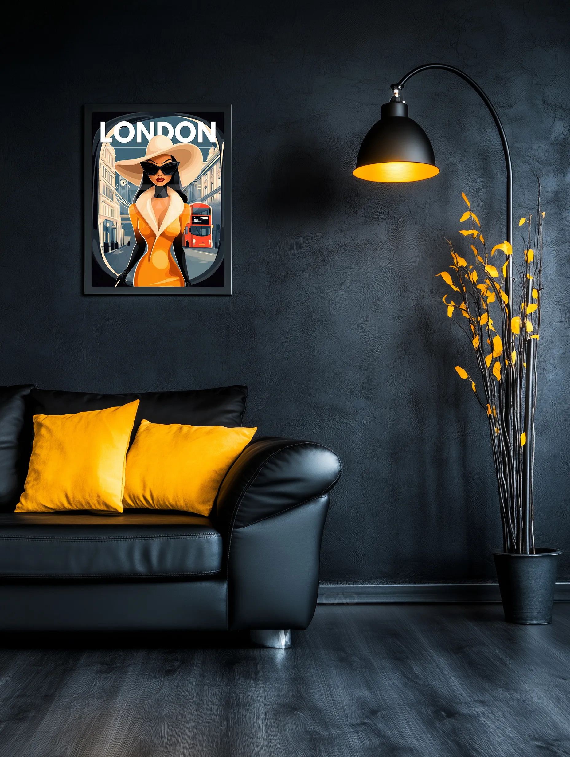 Capture the timeless elegance of London with this beautifully stylized poster. Featuring a sophisticated woman in a chic outfit strolling through the city, this artwork highlights the essence of London’s cosmopolitan charm. Iconic red double-decker buses and classic architecture set the perfect urban backdrop, blending fashion with the vibrant energy of the city.