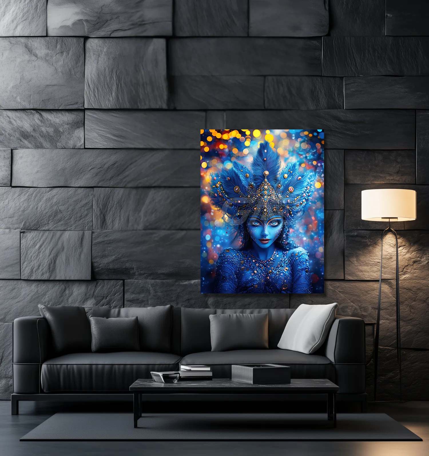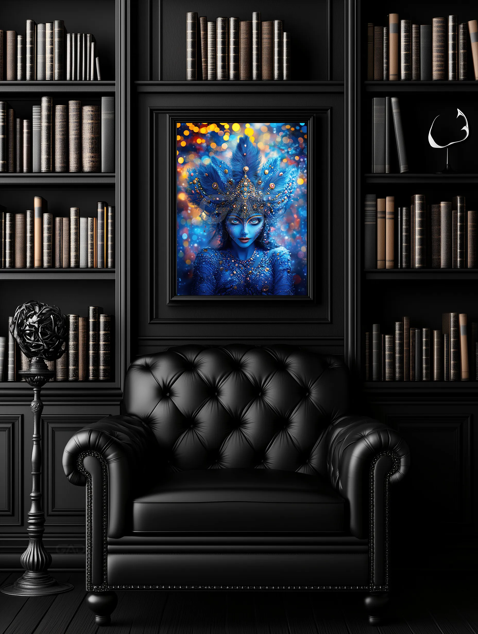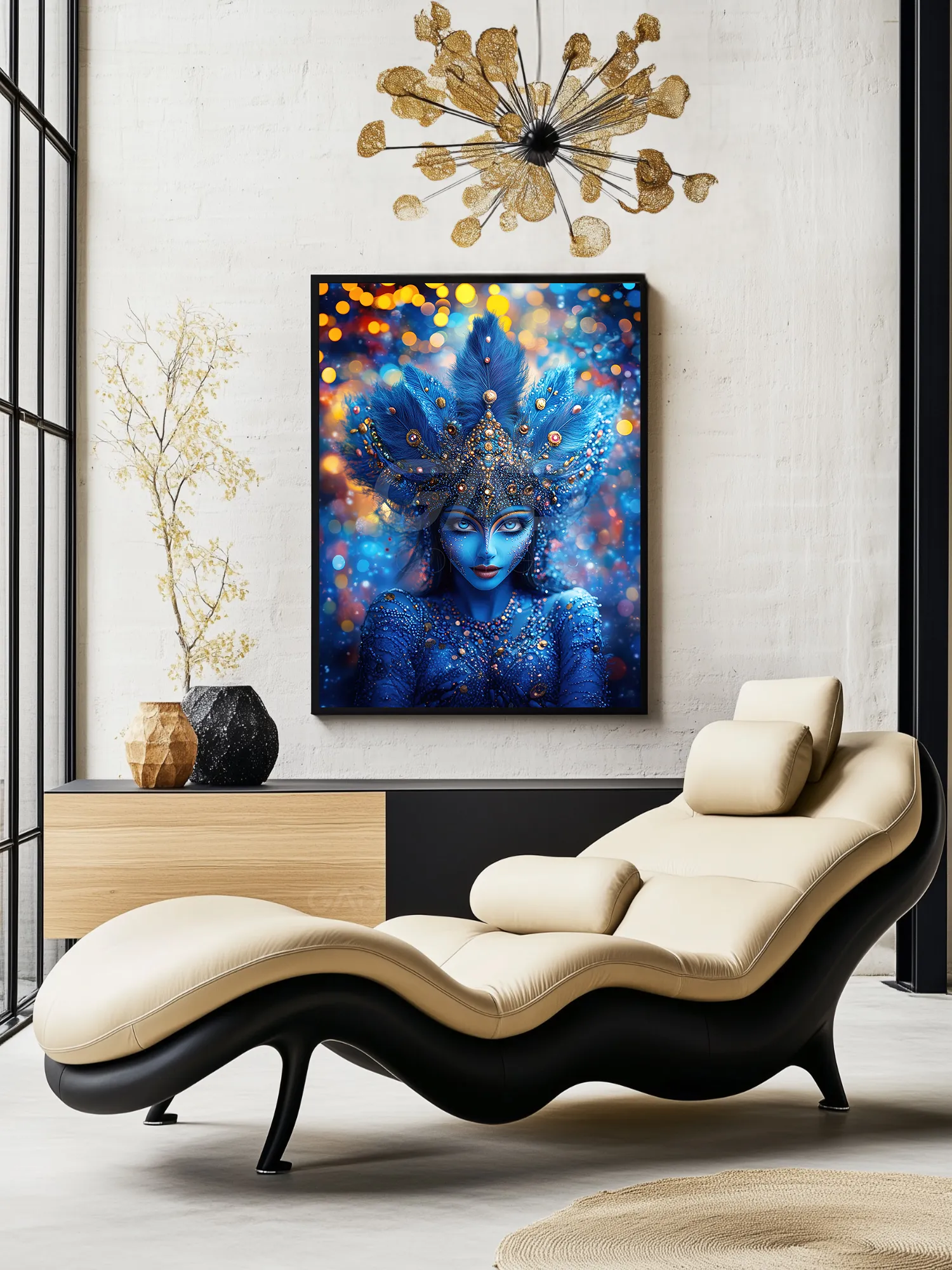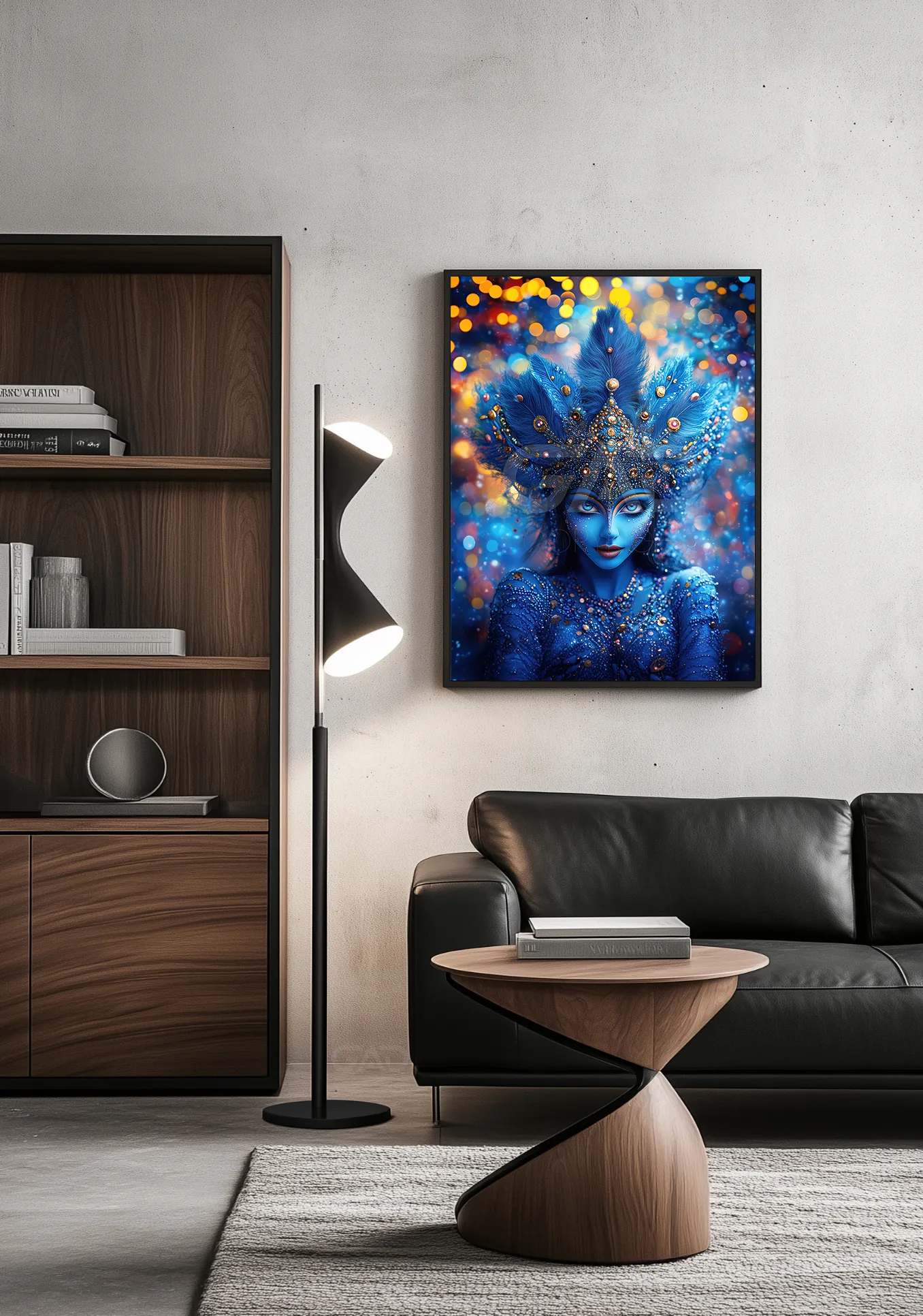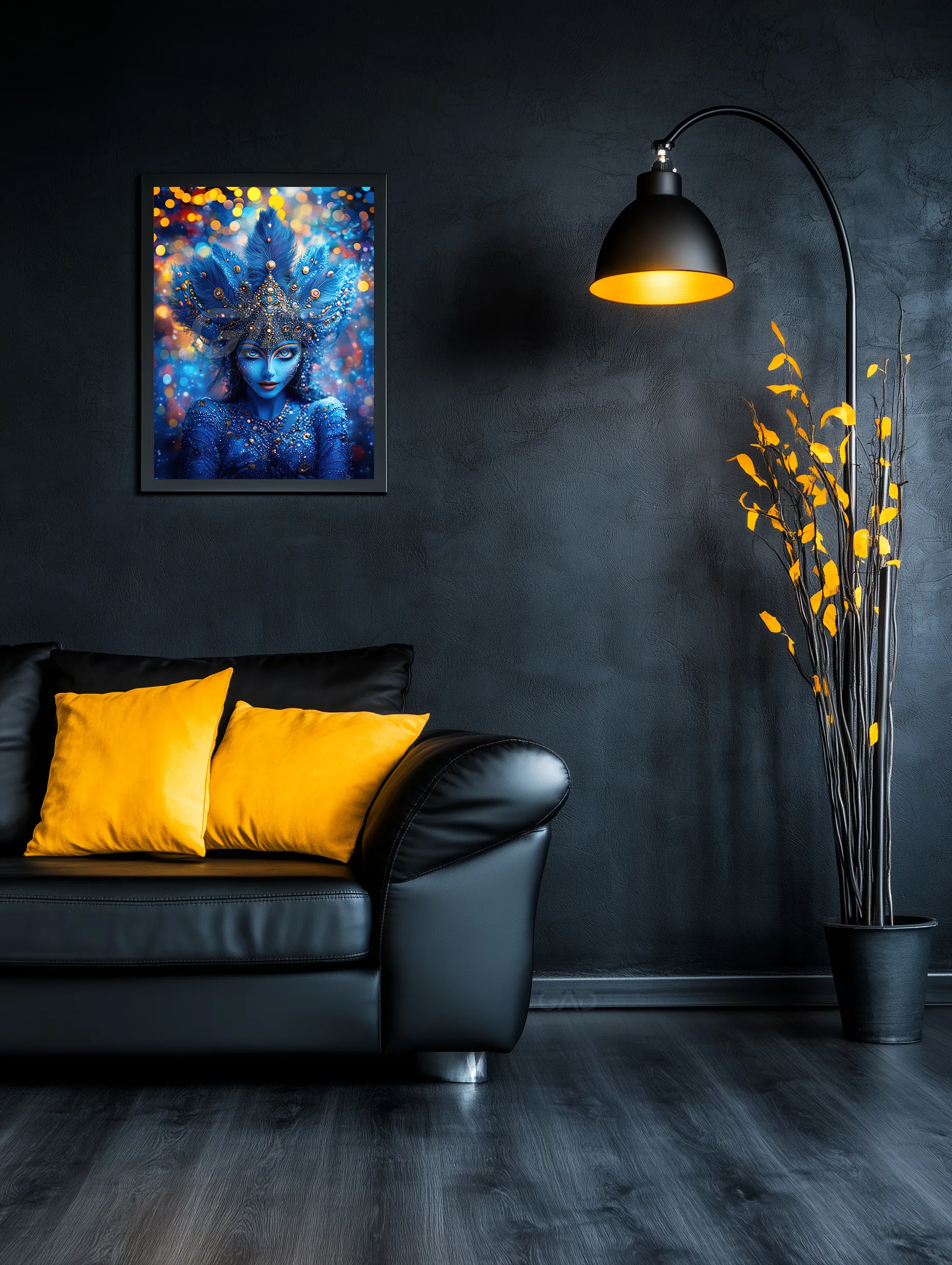 This artwork presents a stylized interpretation of Krishna, the revered Hindu deity, featuring deep blue tones and striking orange accents, symbolizing spirituality and energy.